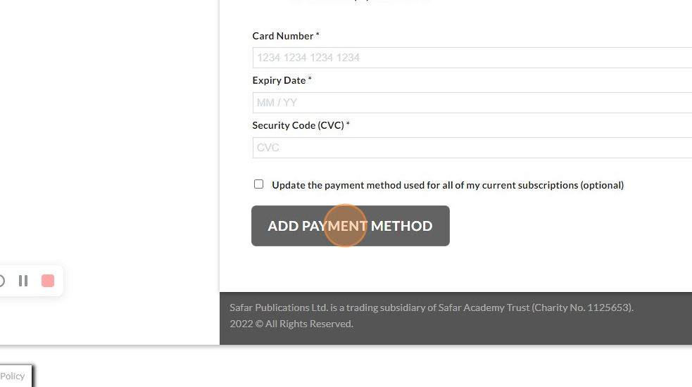 6. You may have your card details stored from purchases you've made on the Safar Publications website previously. If you'd like to add new bank details, click the "Use a new payment method" field.