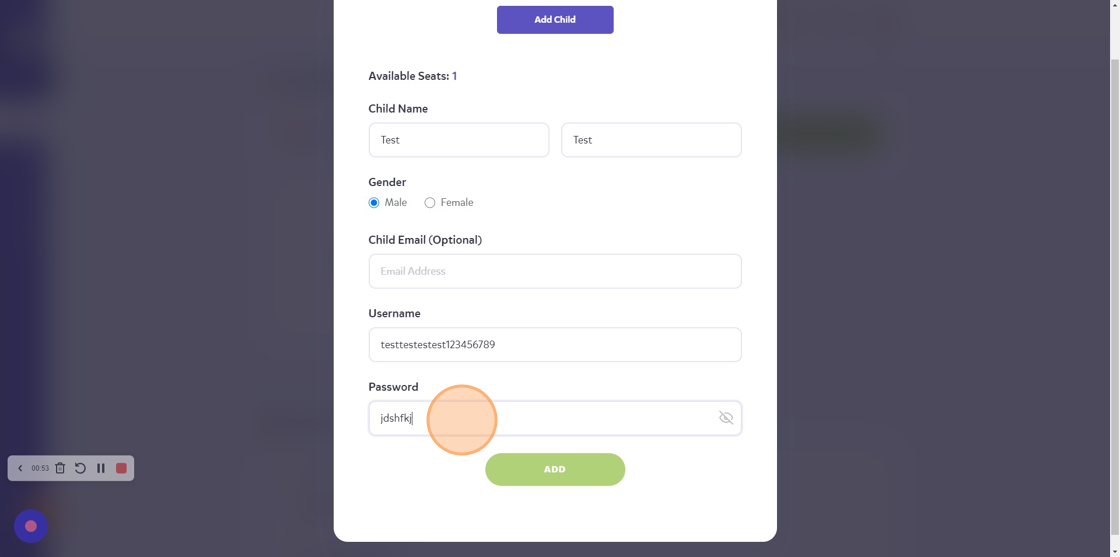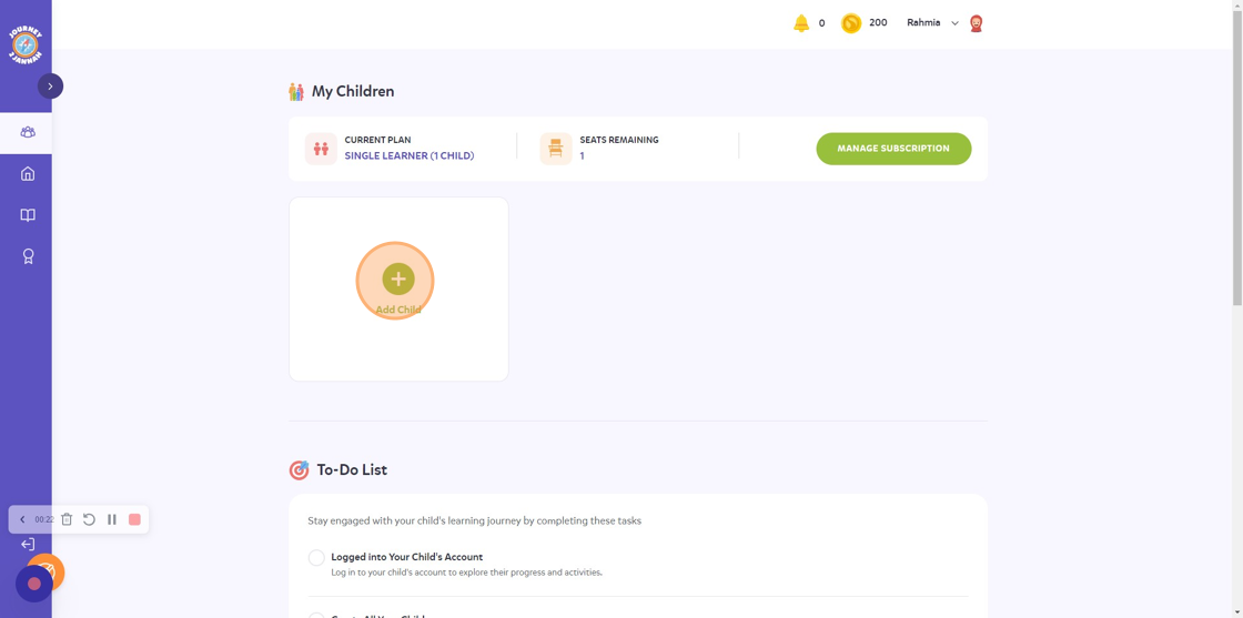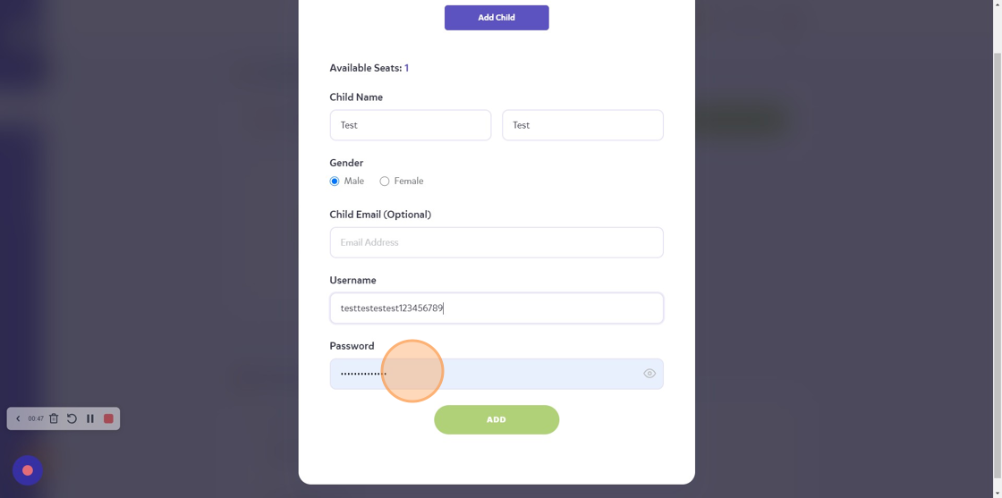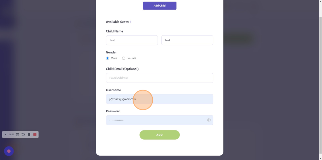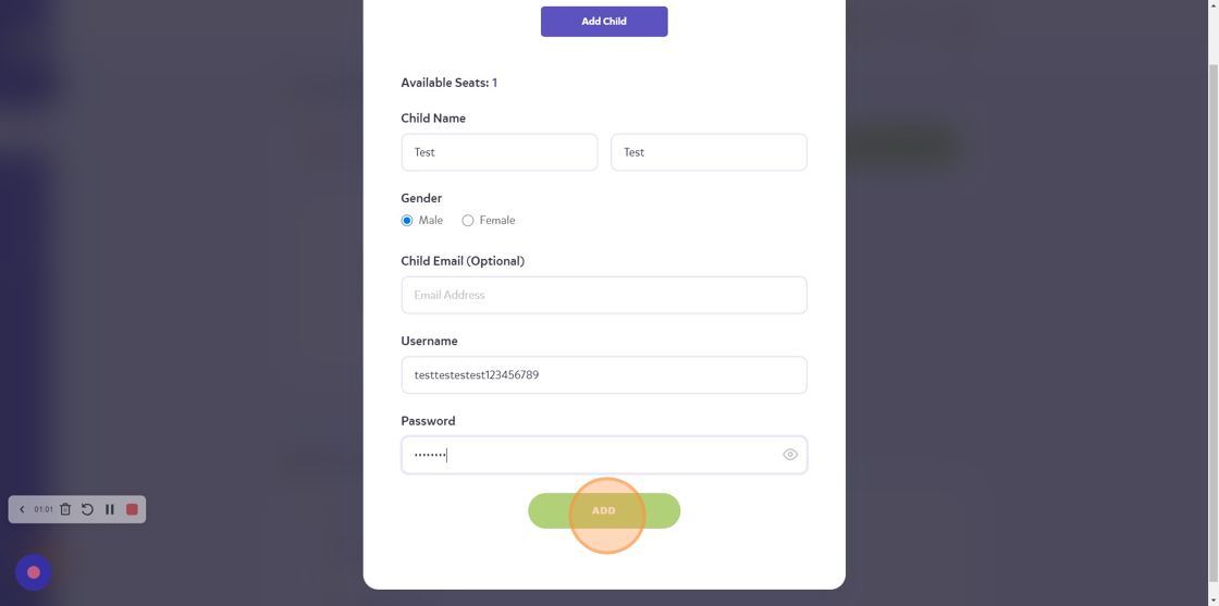 2. On your dashboard, it will show you how many seats you have. Click on the '+' sign to add a child.