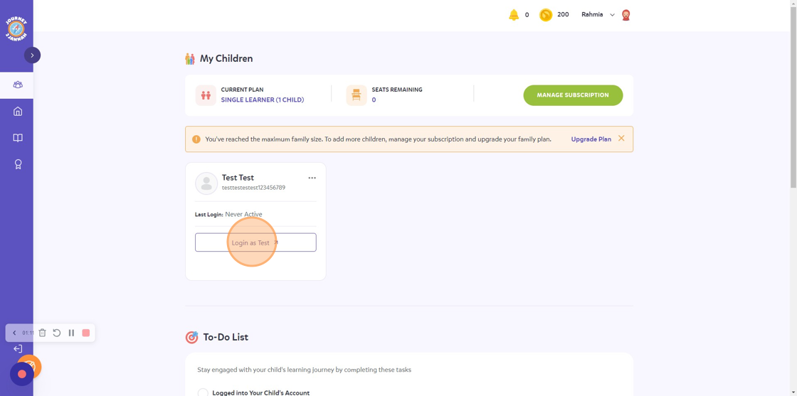 11. As you've used up your seats, you will get a message to increase your subscription if you'd like to add a child. You can now login as the child you've created by clicking on "Login as Test"