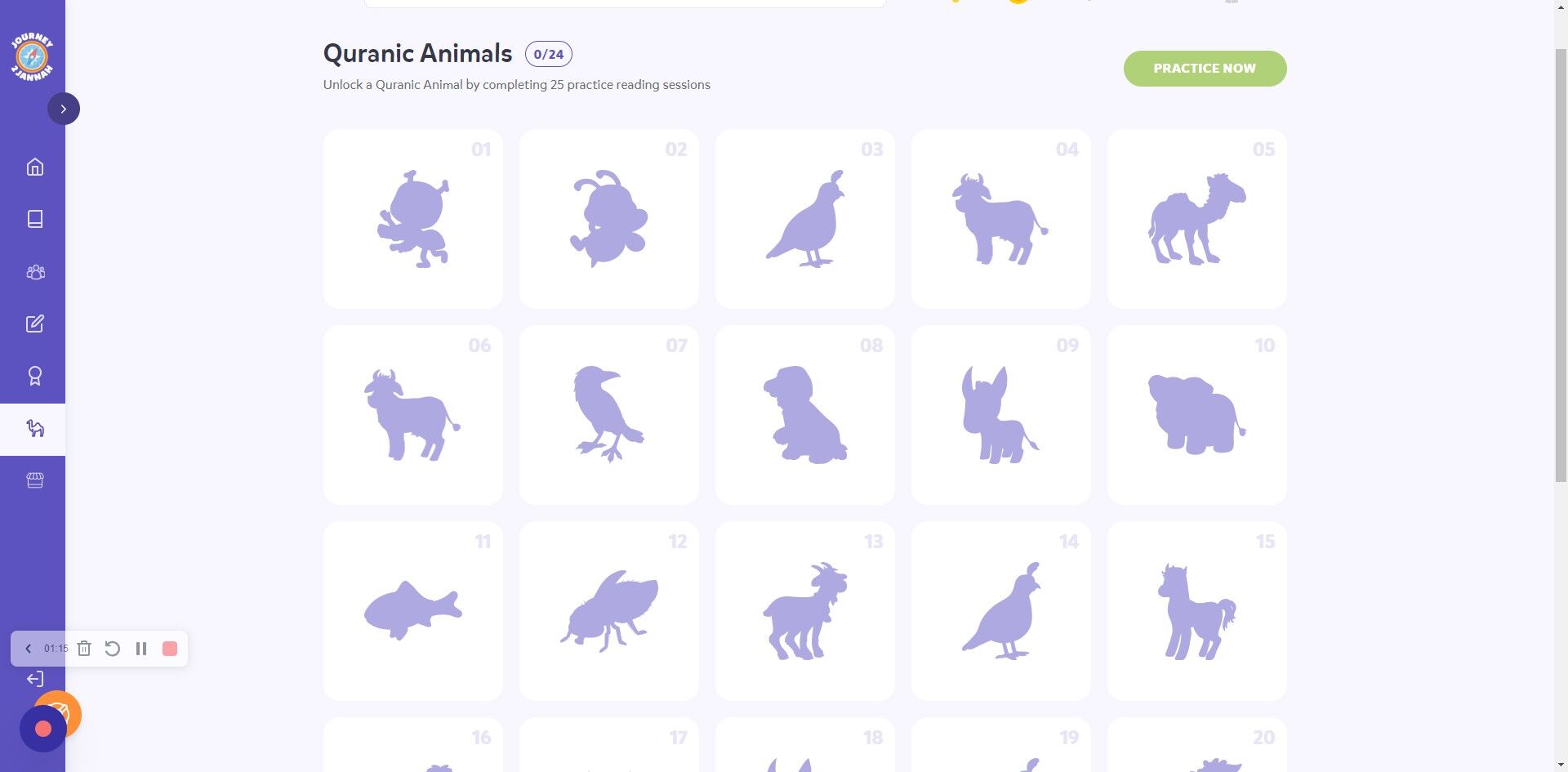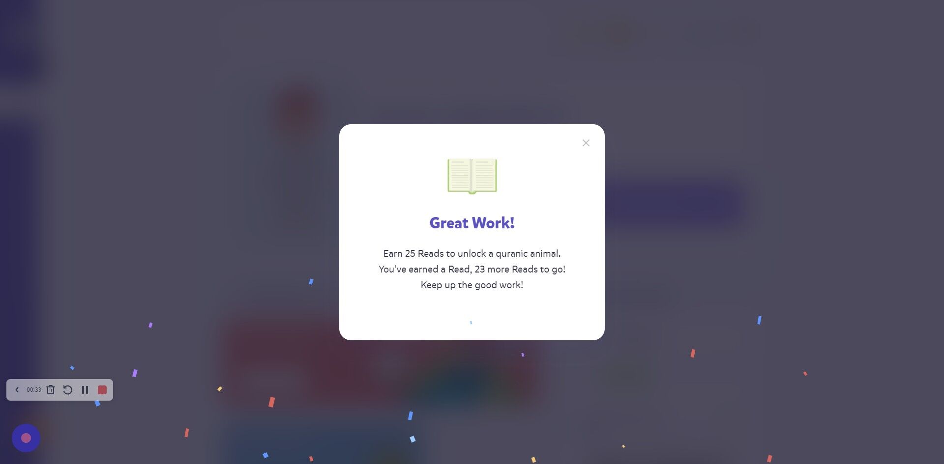 6. It will give you a reminder on how many reads your on. 25 reads lead to a new Quranic animal.
