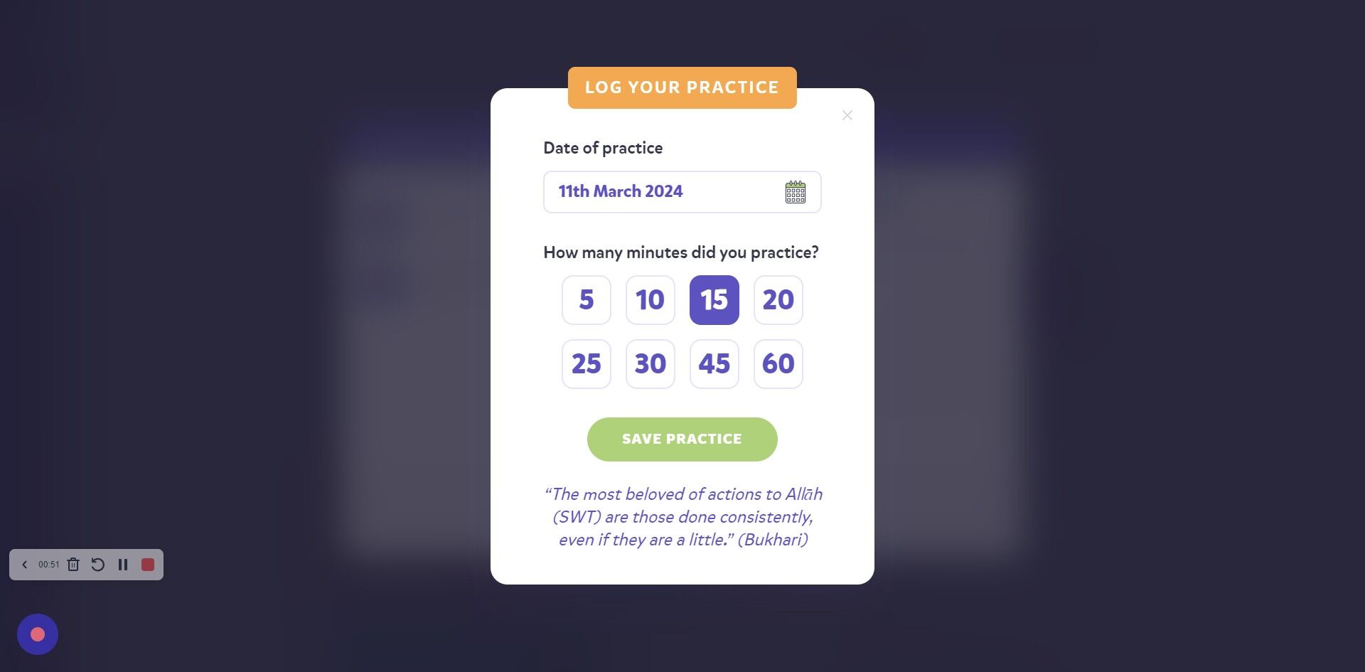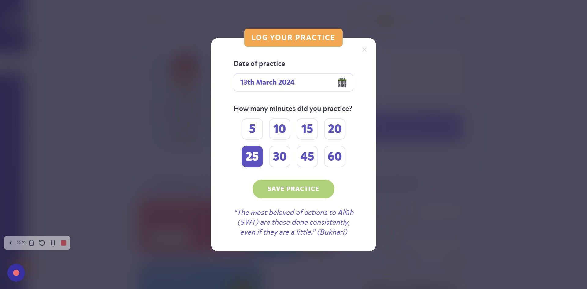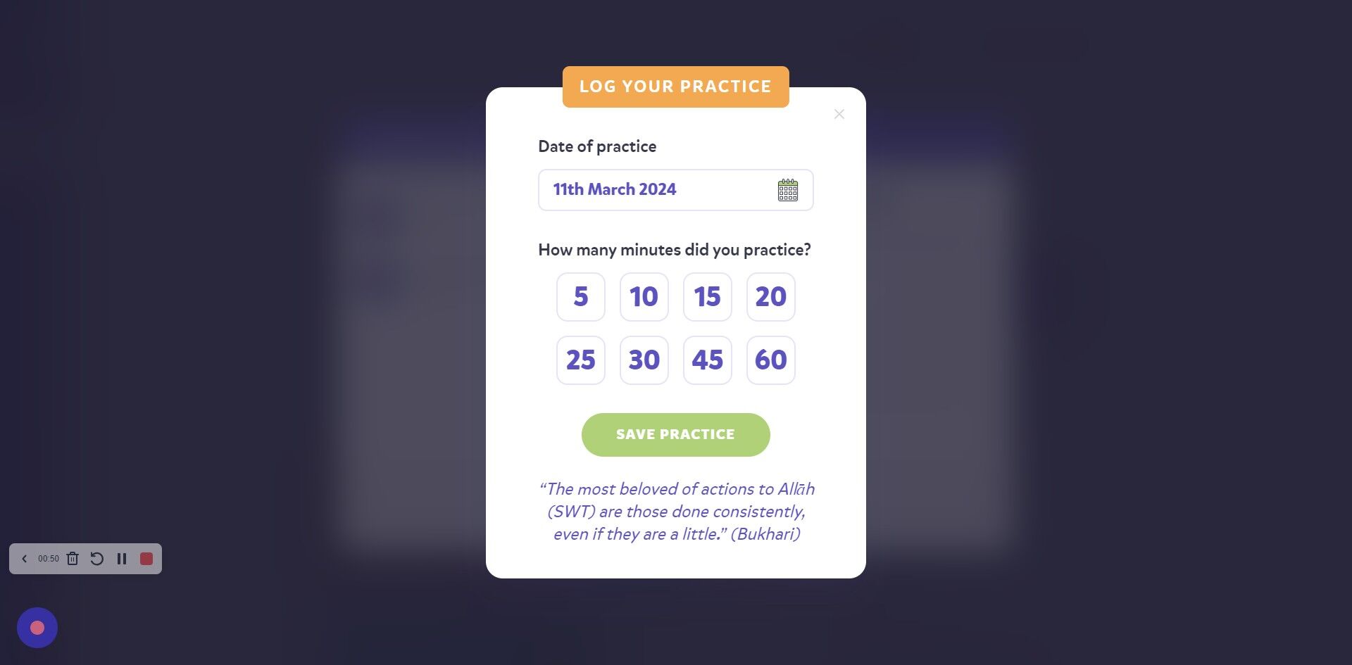 4. You can read the hadith at the bottom for motivation. Click "SAVE PRACTICE" once you've put the minutes on.