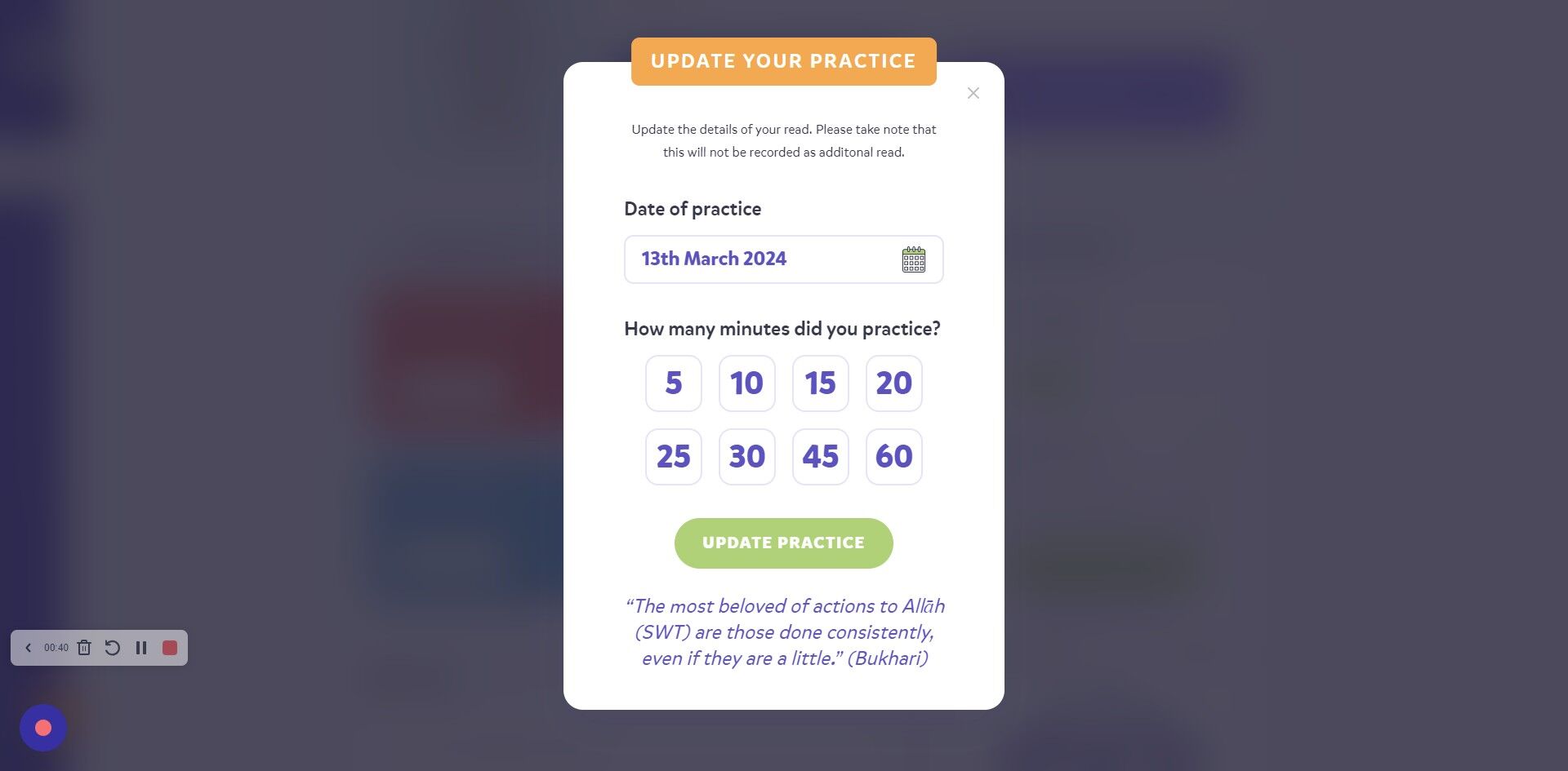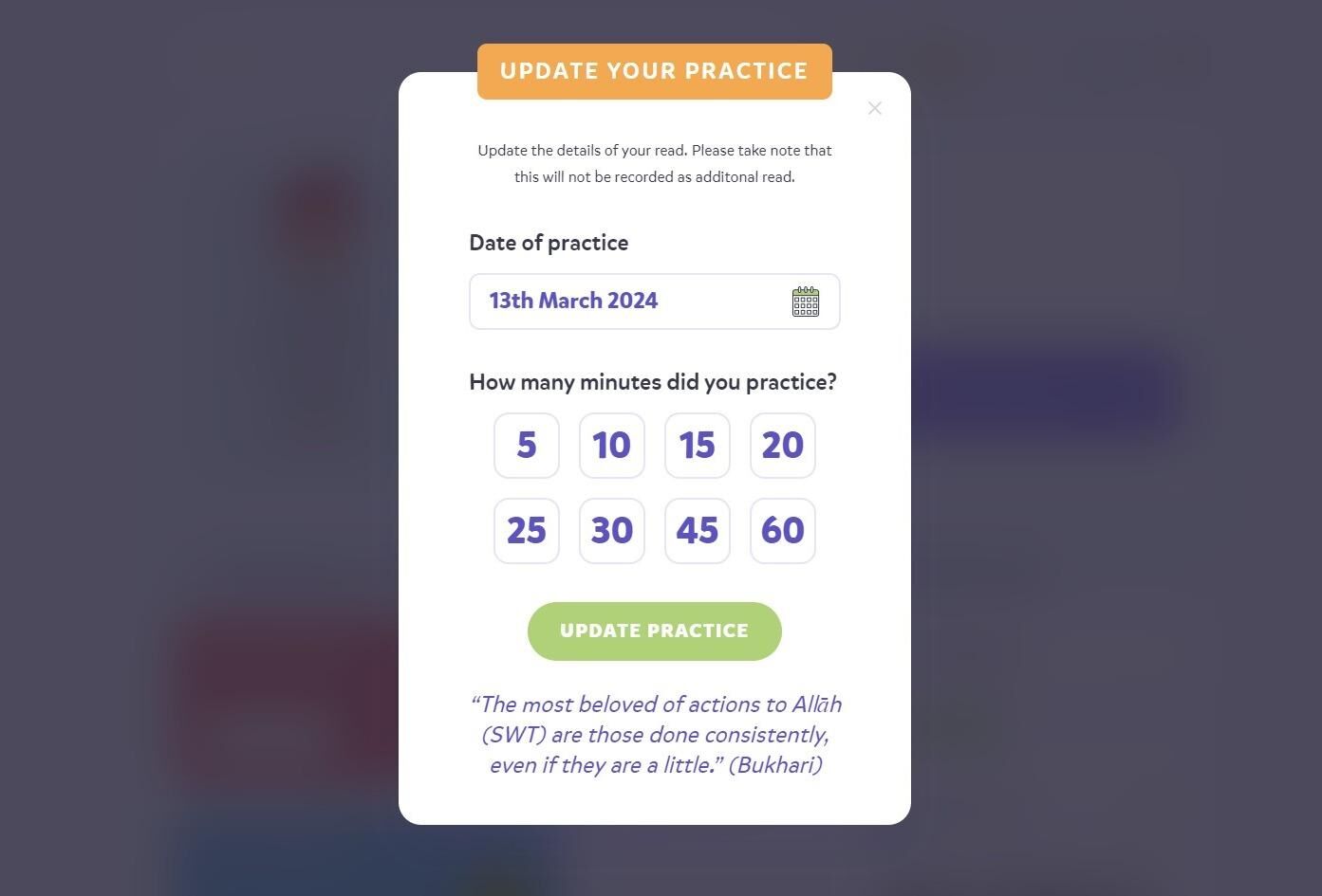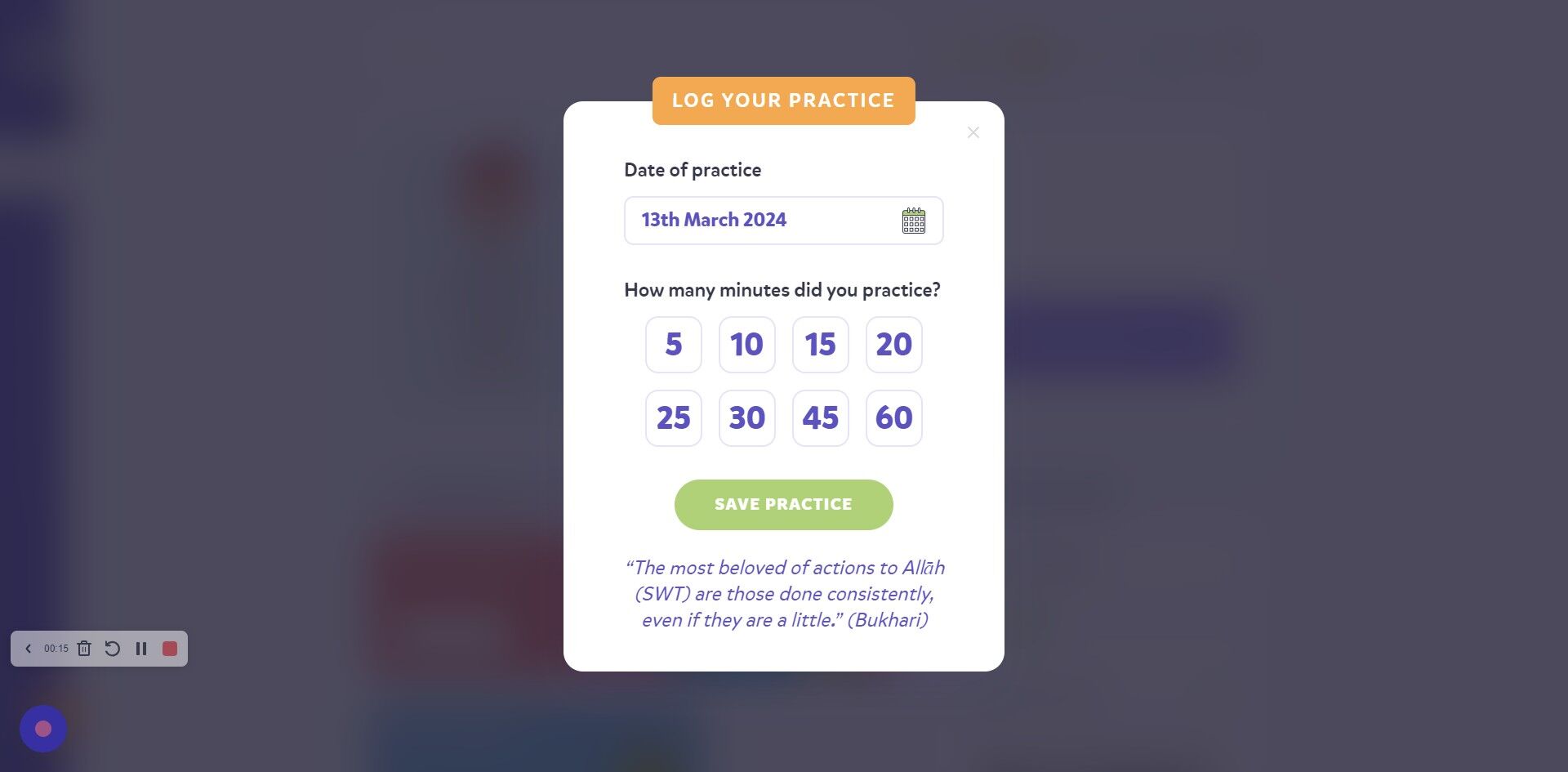 4. You can read the hadith at the bottom for motivation. Click "SAVE PRACTICE" once you've put the minutes on.