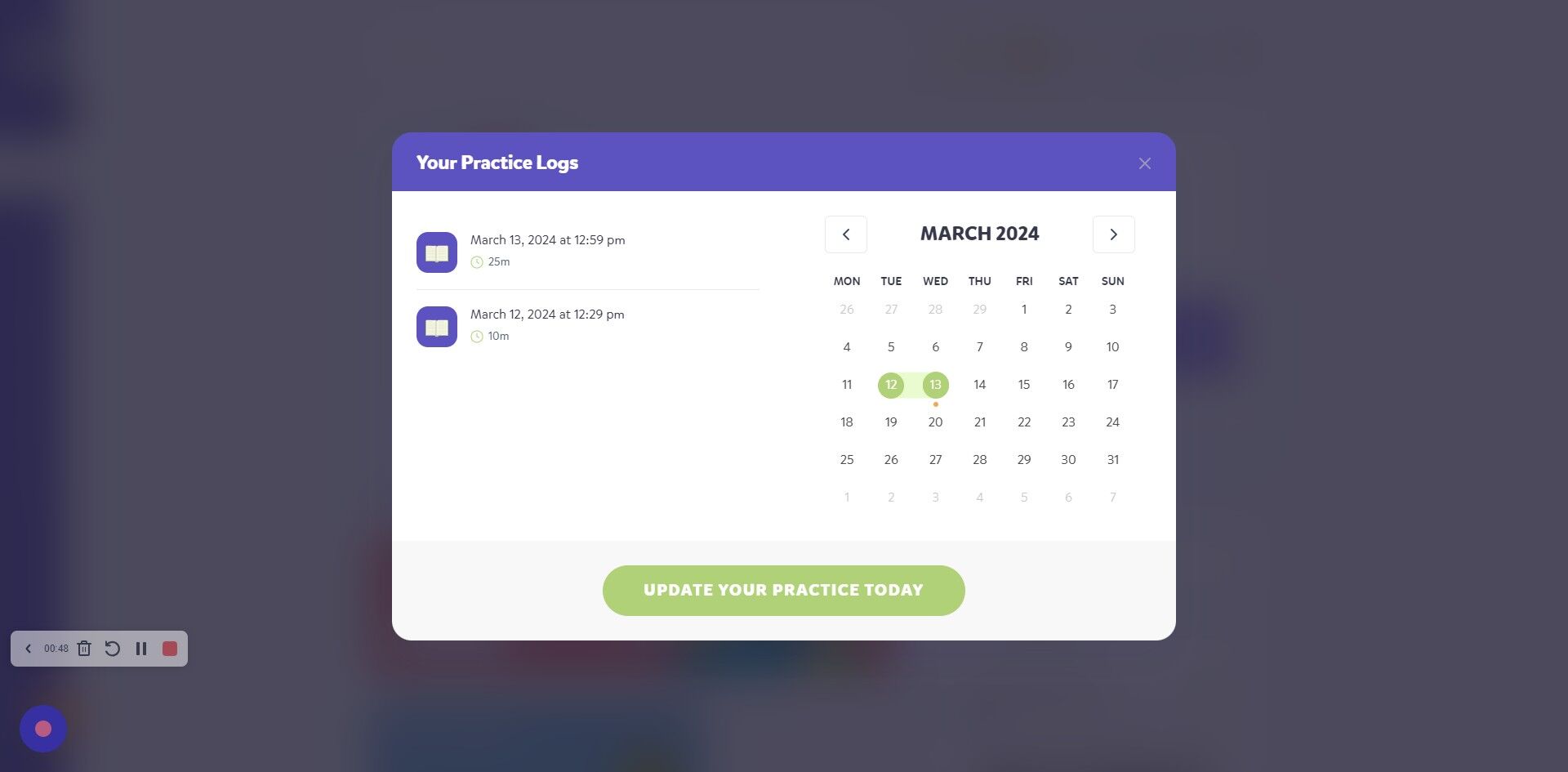 7. Another way to log practice is on the dashboard where you can click on the green button "UPDATE YOUR PRACTICE"