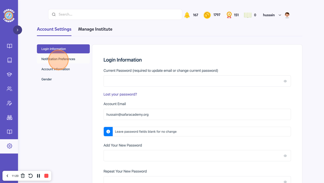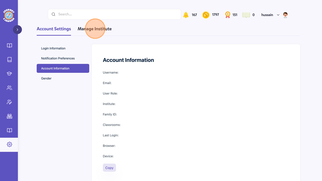 42. The Account Information will allow you get your details. Click "Manage Institute"