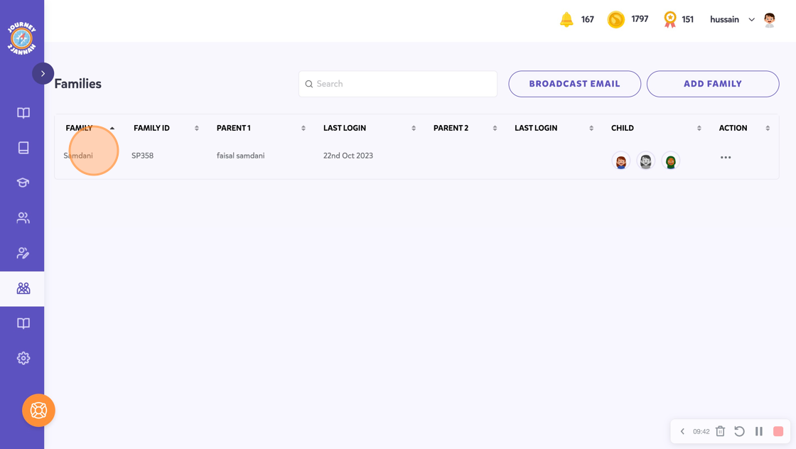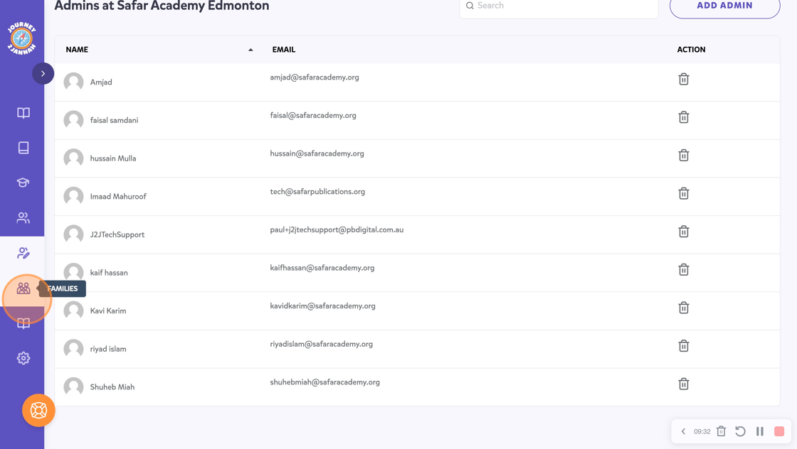 34. You can add Admins and change a teacher into an Admin through this way. You can also delete an admin by clicking on the 'bin' icon. Click on the 'Families' tool on the left side.