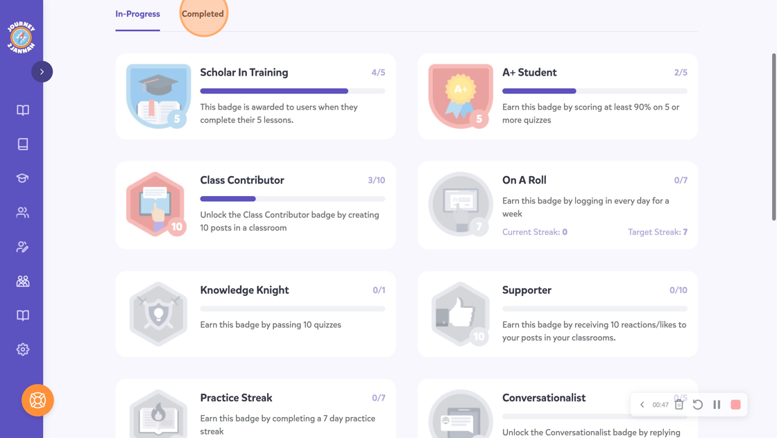 5. This will show your own achievements on your profile. The 'In-Progress' ones and the 'Completed' ones. You should encourage your students to do this too.