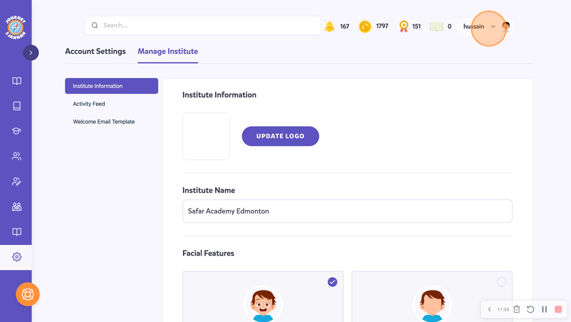 43. This will allow you to change details for your institute such as the logo, name and facial features option.
